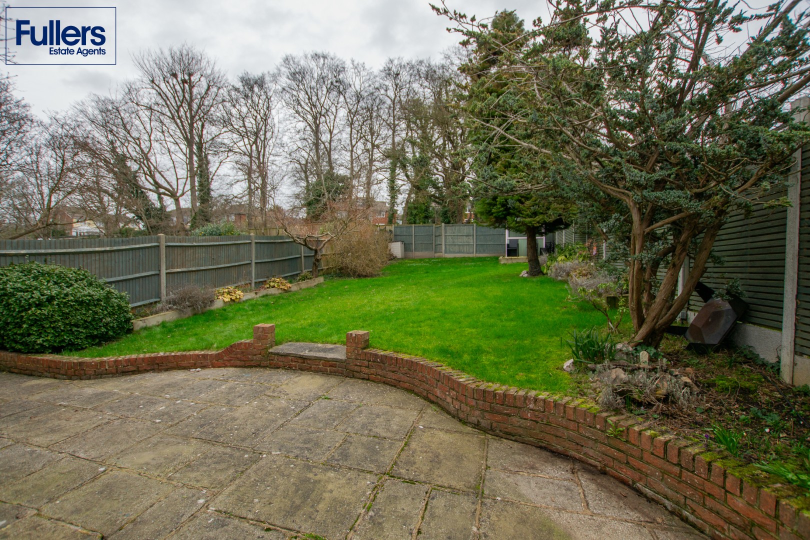 The rear garden is a peaceful, well kept space with a level lawn, patio seating area, and mature borders. The front of the property includes a driveway and garden.